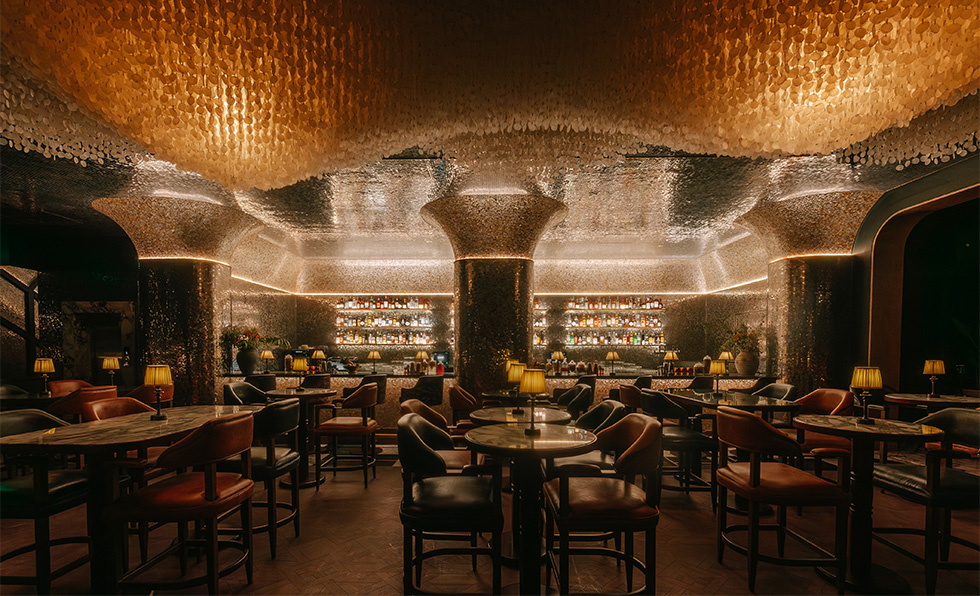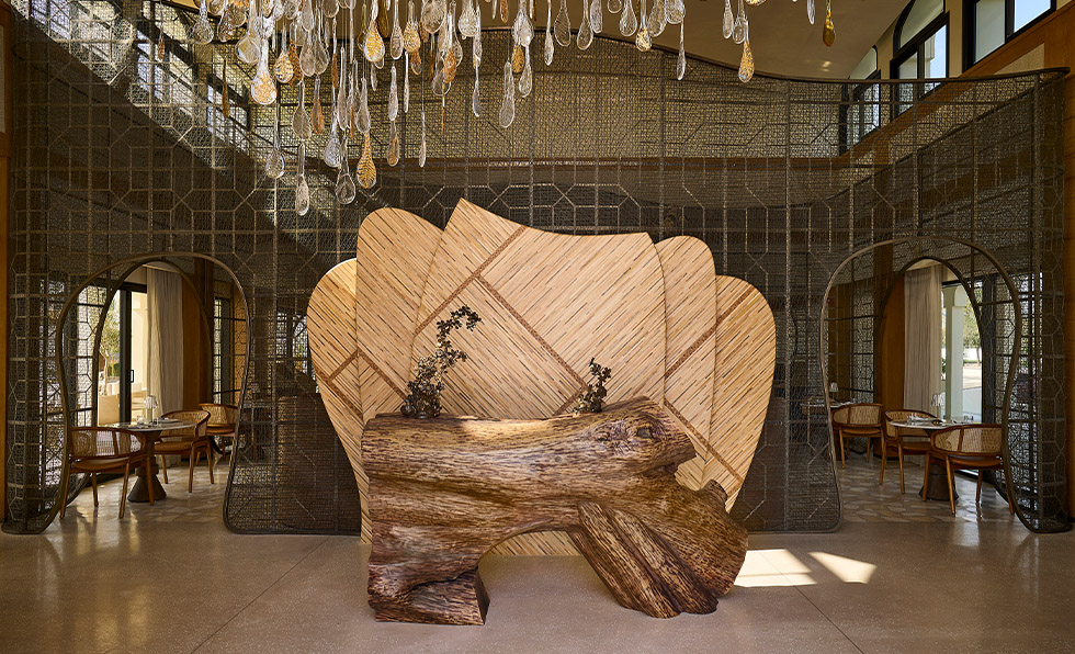 Gerbou, a dining sanctuary tucked within Dubai’s Nad Al Sheba district, translates to “welcome to my home” in the local UAE dialect. Led by local firms Kristina Zanic Consultants and Arkiteknik International, “the space [is] where guests feel exactly that—welcomed and at ease,” says Kristina Zanic, CEO of her eponymous firm. Natural materials and fluid forms define the interiors, accented with brushed metallics and rich tones of amber, emerald, and teal. Heritage plays a central role, expressed through design elements like the intricate Dubai pattern, which appears as a mesh screen at the entrance, green camel-leather stickwork on the back wall, and breezeblocks framing the outdoor bar. Meanwhile, the reception desk is carved from a naturally felled Ghaf tree trunk, with the bronze-topped bar etched with the tree’s silhouette. “Traditionally, people gathered in the shade of these trees, and the bar is doing the same in a modern way—bringing friends together,” Zanic explains. Outside, Urban Landscape created a sense of intimacy with native planting, arcaded courtyards, and a central firepit that evokes the spirit of traditional Bedouin gatherings. “While guests may not immediately notice these elements,” she adds, “they establish a connection to Dubai’s rich history.”