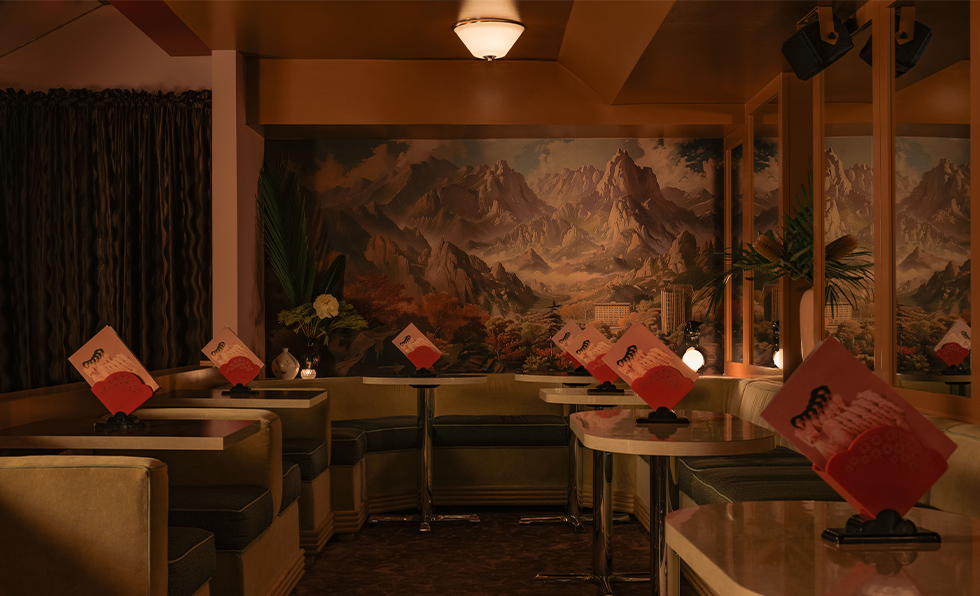 Stepping into Meo, nestled in Vancouver’s Chinatown, feels like stumbling upon a well-kept secret—one that transports guests to a nostalgic world inspired by the carefree nightlife of 1970s and ’80s Hong Kong. Designed by Ste Marie Studio, the cocktail bar and restaurant “feels evocative of another time and place,” says Craig Stanghetta, founder, partner, and creative director of the locally based firm. The concept draws from local photographer Greg Girard’s vivid depictions of Hong Kong and the kitschy charm of vintage love motels. The result is a space layered with textures, curated vintage décor, and details that unfold gradually. Anchoring the room is a glowing retro jukebox, a nod to one of Girard’s iconic bar scenes, while curios collected during owner Tannis Ling’s travels through Taiwan infuse the space with personality. “Each element was selected to build on the layered, slightly offbeat character of the space, encouraging guests to take in details at their own pace,” Stanghetta says. Those quirks include a flea market-sourced portrait of a white Persian cat lounging on a chaise, a vinyl mural inspired by North Korean hotel lobby art, and pendant lights that nod to 1950s Jell-O molds. “It’s meant to be immersive,” Stanghetta adds, “in a way that allows each visit to feel like its own discovery.”