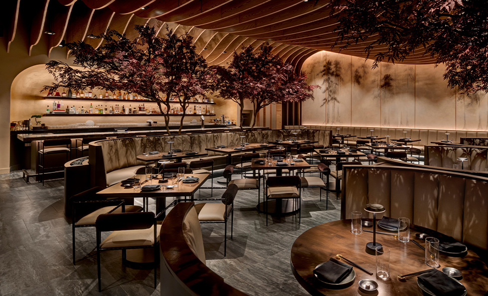 Adventure calls at Nami, where an air of mystery promises escapism in the form of a singular dining experience. Housed within the art-driven Wave Hotel, Nami comprises a cocktail bar, 10-seat omakase, and an intimate dining room across 4,400 square feet. “The design of Nami is all about creating a journey. We wanted to invite guests into a space where architecture and the experience of dining come together in perfect harmony,” says ASD|SKY project architect Steven Fendley. The voyage begins at the tranquil arrival space, which then opens into the windowless dining room, where focused lighting and a curated sound design immerse diners in an escape from reality. Authentic materials from gold leaf to red-grained wood embolden the qualities of the cuisine while silky Japanese Maple trees draw in nature. A backdrop of haunting Dean Barger murals completes the ethereal effect beneath a wooden ceiling whose panels undulate akin to an oceanic swell. “Our goal was to create a space that feels truly transportive,” adds Ethan Lewis, ASD|SKY project designer. “Every detail is intended to make guests feel like they’ve stepped into another world.”