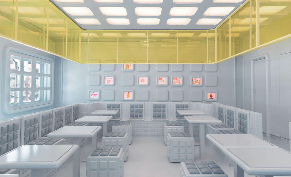 Masquespacio’s signature balance of function and whimsy ensconces guests in a visual homage to Novu Waffle’s eponymous treat. “When the client connected with us, we saw a waffle brand with a fun approach,” Masquespacio cofounder Christophe Penasse says. “We thought why not use the form of a waffle and create a pattern with it that would make the whole space a waffle experience.” A distinctive grid pattern distinguishes the façade as well as the interior, with doors and windows decorated with the motif in every direction. The central rectangle of brickwork further alludes to what’s on the menu, with a cubicle seating area populated with tables, stools, and cushions whose forms all honor the theme. Offsetting the muted pale blue backdrop is a yellow structure installed overhead for contrast—also complete with its own gridded look. Rounding out the visitor experience, the queue orients guests around the central cubicles before concluding at a wall adorned with brand iconography and messaging that reflects the Valencia-based studio’s playful ethos. “We want them to have a moment of fun,” Penasse adds. “A waffle can make you smile and laugh. It’s all about having a waffle while being surrounded by waffles.”