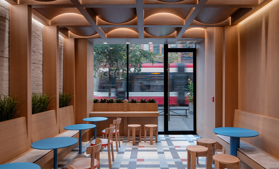 To launch its newest outpost on King Street West in Toronto, Pantry turned to local firm Denizens of Design. With its four other restaurants situated in more residential neighborhoods, this “location is geared more to business and nightlife, so it needed to give Pantry the opportunity to grow and evolve into a new demographic,” says principal Dyonne Fashina. To achieve this, Fashina and her team reinterpreted Pantry’s signature basketweave floor tile, extending the motif throughout the space in unexpected ways—including inverting and magnifying the flooring pattern to the ceiling. Rather than building new elements from scratch, the team clad the existing long white beams with wood veneer, then added cross beams to complete the woven-ceiling effect. To further maintain familiarity, Pantry’s signature wood tones and color palette (black, white, and oak) remain, expanded with some deeper hues of streetcar red and bold blues. The weaving pattern appears once again in a red macramé wall piece, created by textile artist Diana Watters. “Everything about the space calls back to weaving, but it’s subtle,” Fashina says, “and strategically placed to make sure that throughout the journey within the space you’re getting that.”