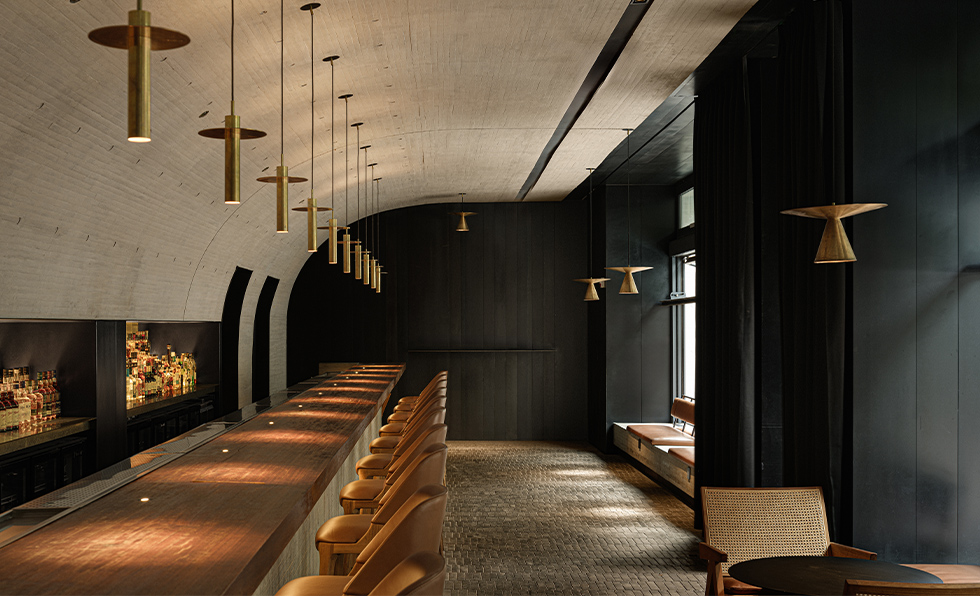 Whisky Bar resides in a former commercial structure whose industrial bones inform a monastic design. The concrete façade welcomes visitors with a trio of arches that convey strength. “They not only enhance the aesthetic impact but also invite intimacy within the space, offering a contrast between the rawness of concrete and the refined atmosphere,” explains Johan Sarvan, founder and architect of Beijing-based JSPA Design. “We appreciate how Brutalism and raw, monolithic materials create distinctive, lasting impressions while still maintaining a connection to the environment.”