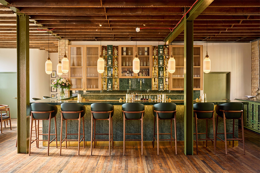 Rendered in green marble, the Fords Gin bar at Thames Distillers in London was conceived by renowned bartender Leo Robitschek