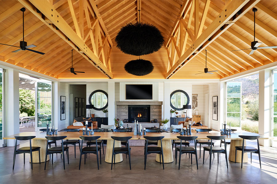Leslie and Rich Frank were married at Miller House, a barn on the grounds of their Calistoga, California winery Frank Family Vineyards, so the structure holds special meaning for the couple. Now reborn as a hospitality space by the late architect Howard Backen and Napa Valley-based Hawkins Interiors, Miller House provides “an elevated yet inviting experience for guests. Our goal was to capture the essence of Napa, while giving it a stylish edge inspired by Leslie’s eye for fashion and design,” says firm founder Julie Hawkins.