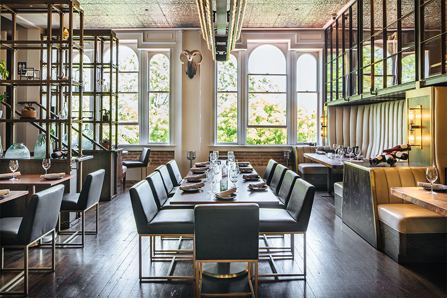 Her team also “leaned into medium wood tones for the tables and furniture, pulling in the warmth of the stone walls,” she says. “You can feel the history from the building itself.”