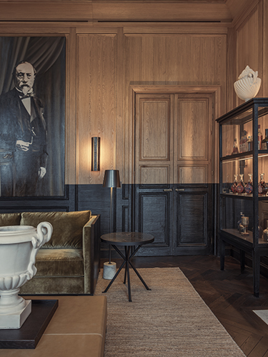 Isabelle Vignon, Courvoisier’s historian, was instrumental to the process, and “this deep dive into the archives allowed us to design the bar, lounge, and salon, a space enriched with carefully curated archival pieces that narrate the story of the Maison,” she adds.