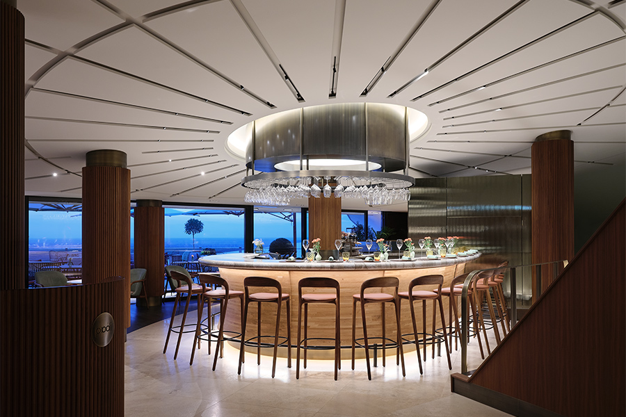 Bronze metal and mirrored glass accent the bar, restaurant, and tasting room. At the bar, the overhanging shelf and radial ceiling pattern direct the eye “toward the center, amplifying the spatial language and enhancing the sense of grandeur,” Genova says. “The tasting area extends beyond the building’s signature saucer shape, seamlessly connecting with the interior garden. This integration creates a tranquil, almost meditative atmosphere.”