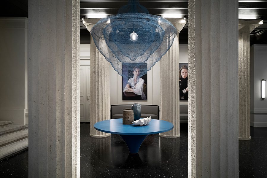 Artworks, made in collaboration with Zoltán Tombor, are enhanced by blue accents at the Dorothea Hotel