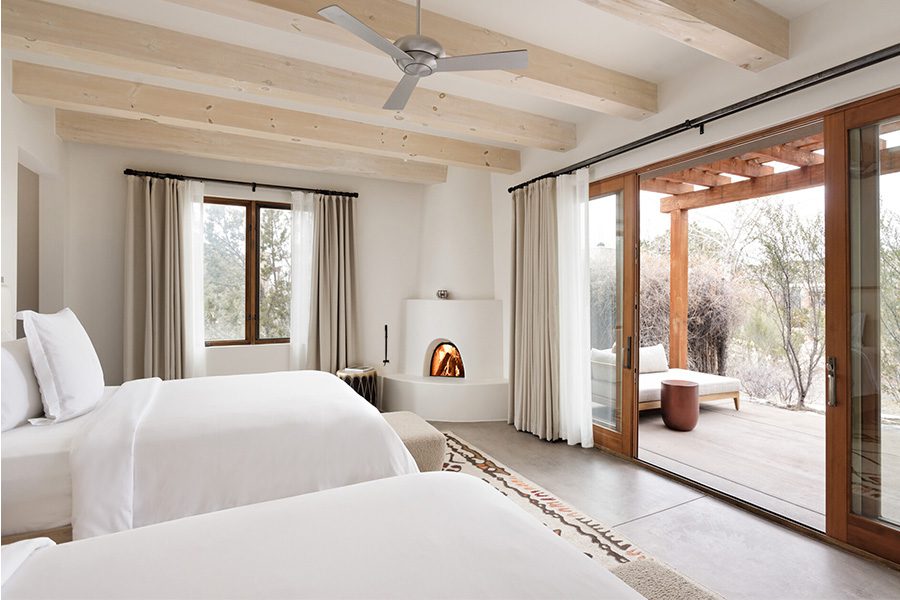 At the same time, bigger brands also began taking notice, including the Four Seasons Resort Rancho Encantado Santa Fe, which completed a multimillion-dollar refresh last spring. Nicole Surget, principal of Langlois Design in San Rafael, California, says she leaned on ties between Puebloan architecture and modernism to give the 65 guestrooms an organic and zen feel. “It was very important for the space to evoke a sense of place and pay homage to the native cultures,” she says. “I tried to be very thoughtful and purposeful with each element introduced to be sure the room was telling the story of the location in a pure and simple way.”