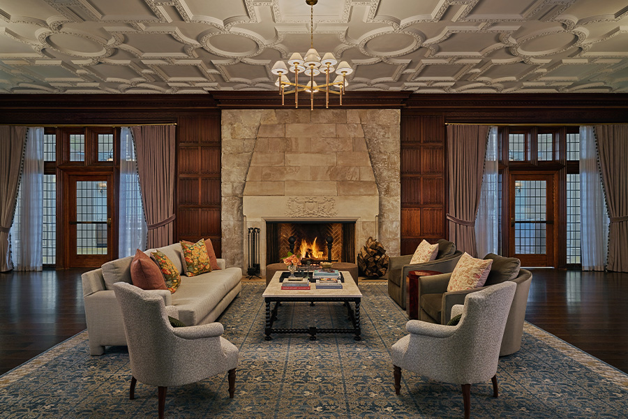 The mansion’s Great Room, anchored by an original fireplace, pairs ornate plaster ceilings and rich wood paneling with modern furnishings