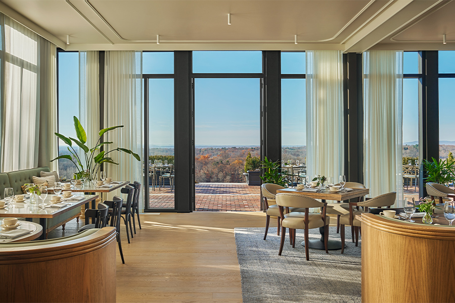 Ladd’s Tavern, a new addition adjacent to the Great Room, provides a striking contrast to the mansion’s moodier palette. The bright and airy all-day restaurant invites guests to linger in its greenhouse-like layout, where the golden hour sun spills through expansive windows, reflecting off the light wood and neutral tones. This same sunlight is captured on the second floor of the mansion, where event spaces include a spacious ballroom that opens onto an outdoor terrace with sweeping views of the surrounding hills.