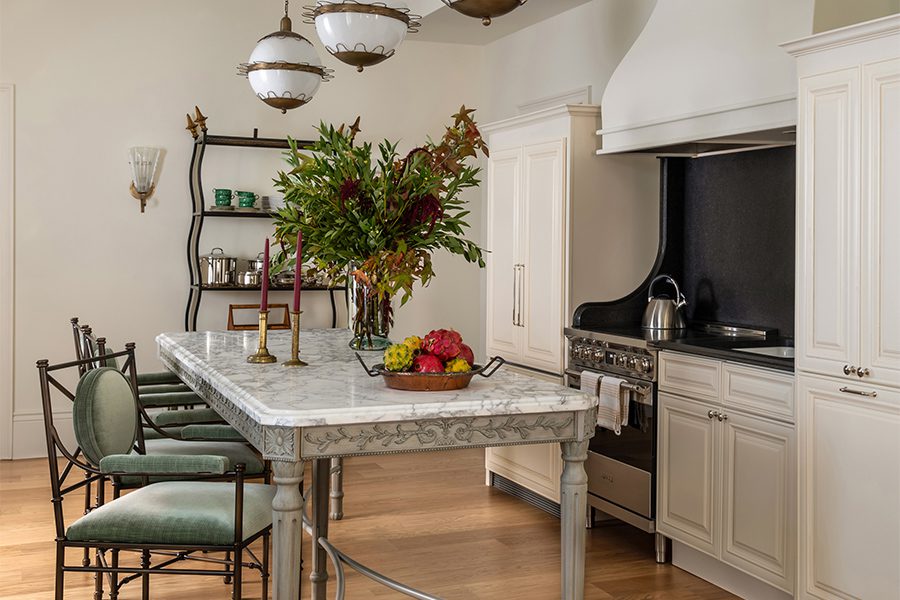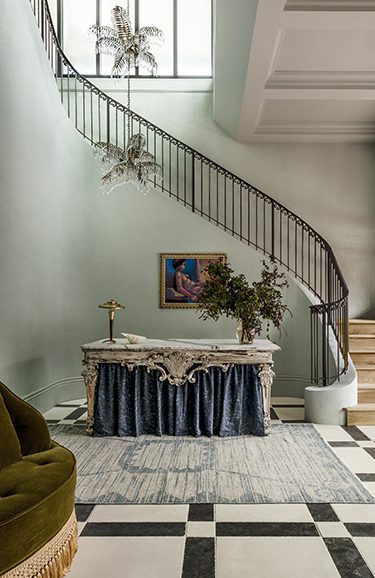 Most of the furnishings are custom, taking cues from French antiques, as is the wallpaper dressing the bedroom ceilings. It showcases “a séance-like dance incorporating both spiritual and ritualistic objects inspired by voodoo art but drawn in a loose French expressionist style,” adds Gray. “The idea we wanted to celebrate is that New Orleans isn’t a singular design movement.”
