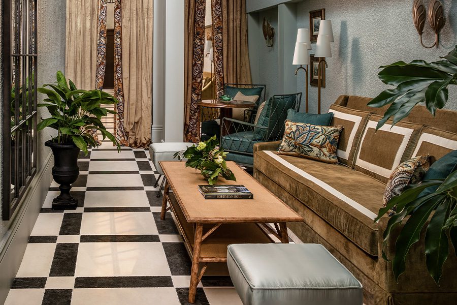“The jewel tones in the living rooms and public spaces are also an homage to New Orleans and its opulent history as a center of trade in the 18th and 19th centuries. We love the juxtaposition of super luxurious textiles—richly hued velvets and tassels—in the context of a coastal city with Caribbean, Spanish, and Creole influences,” explains Gray.
