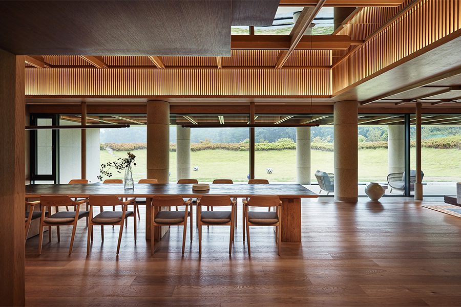 Ceiling details in the lower-level rooms reinforce the project’s melding of old and new. A reference to the intricate art of weaving, they “symbolize the interconnectedness and harmony that is central to Korean culture,” says Kim. “The woven motif, carefully crafted to create a sense of texture and rhythm, enhances the room’s warmth and depth.”