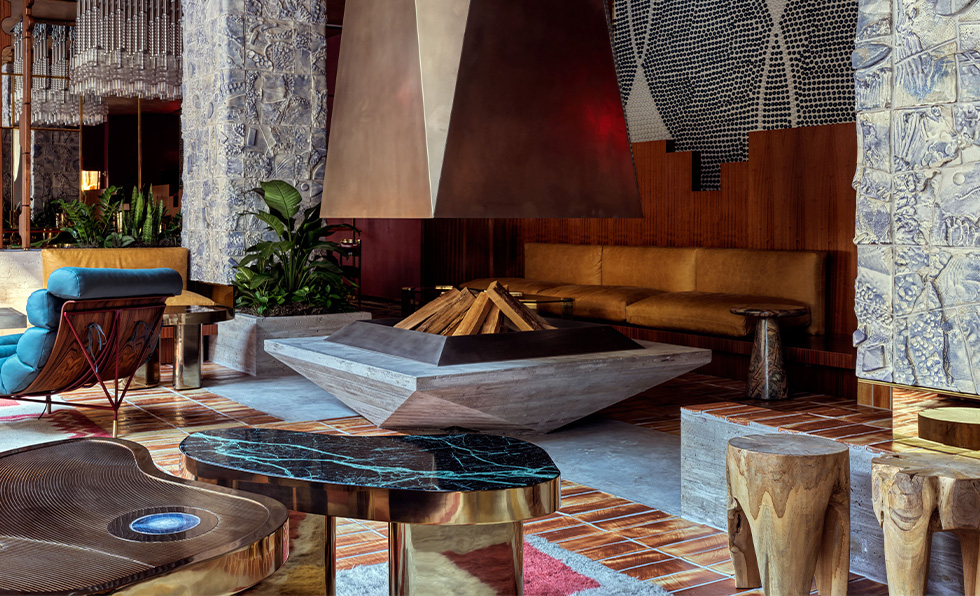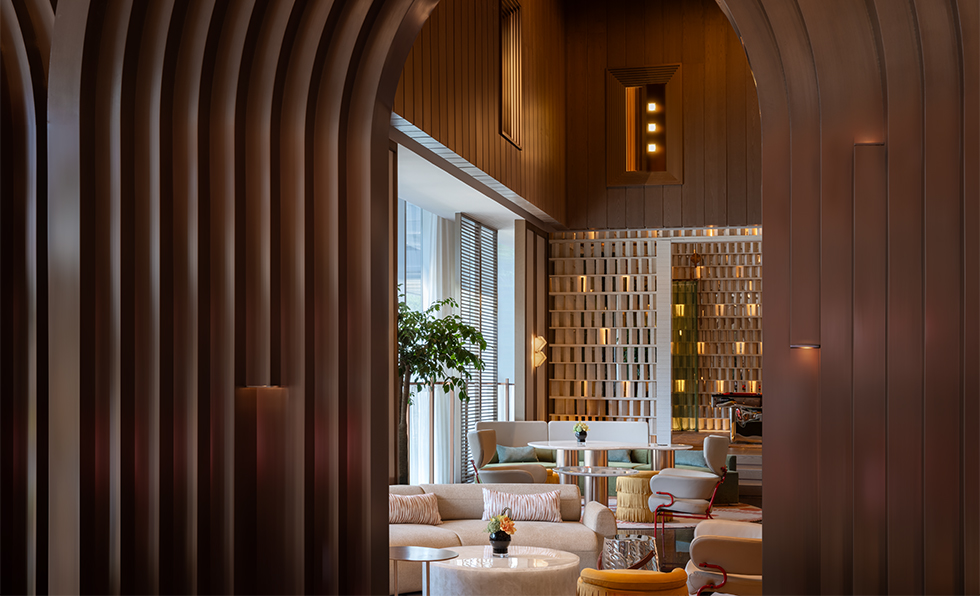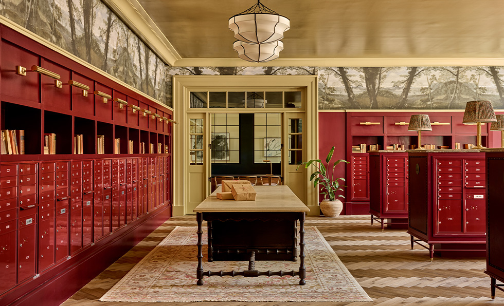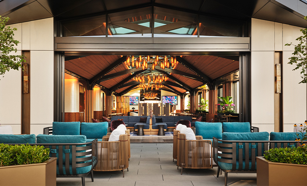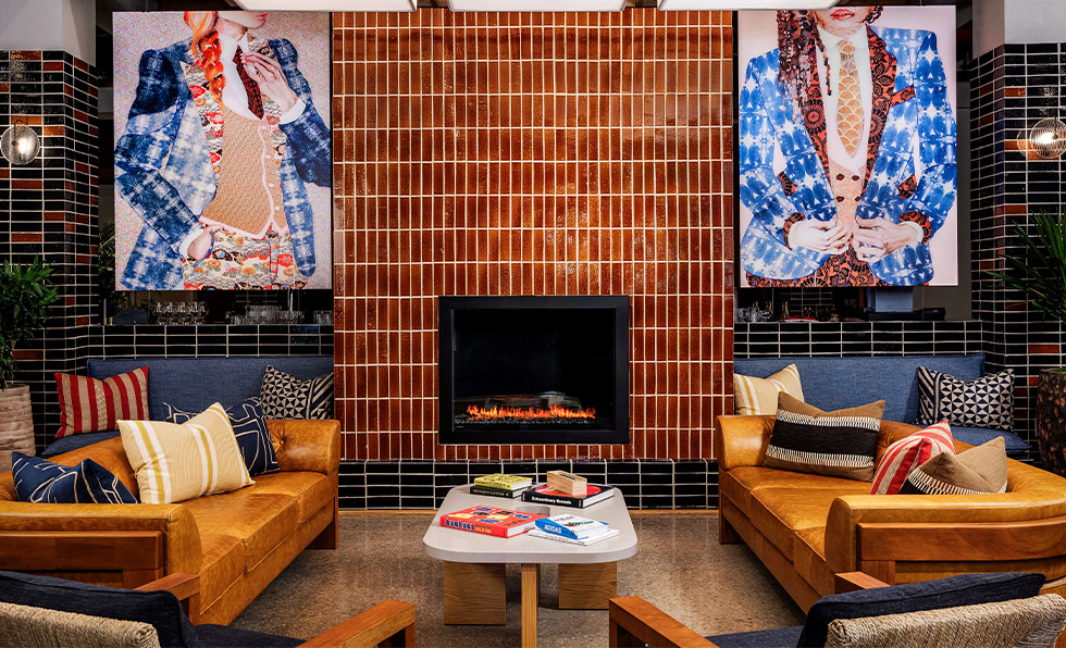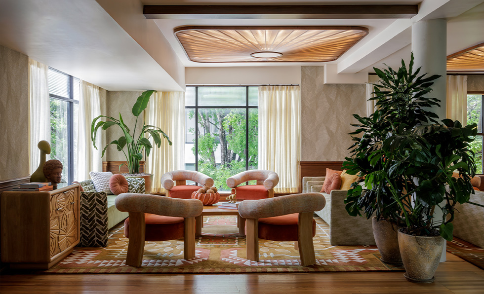 Guests who check into one of the two properties in Highgate’s budding Romer Neighborhood Hotels collection will fast become acquainted with some of the best local businesses and artists. “Mayors of the Block” act as community advocates and connectors, and QR codes provide instant access to maps and events. The properties’ interiors draw from the surrounding area too, centered on flexible venues that morph from day to night and guestrooms that feel like apartments. “Each Romer becomes a canvas for local expression—an open door to the stories, flavors, and creativity that make each neighborhood unique,” says Highgate CEO Arash Azarbarzin. Los Angeles-based Indidesign handled Romer House Waikiki (show), mixing woven textiles with matte black and dark blue colorways; works from Hawaiian artists; and the area’s last functioning, intricately restored 1960s neon blade. In New York, locally based firms Islyn Studio and Goodrich collaborated on reviving a 1960s building through serene guestrooms and public spaces like So&So’s, the clubby piano bar outfitted in deep red banquettes. “Every Romer is thoughtfully designed. From the eclectic streets of Hell’s Kitchen to the island clubhouse energy of Waikiki, our spaces are curated to foster connection and create meaningful ways for guests to engage with the fabric of their surroundings,” adds Azarbarzin.