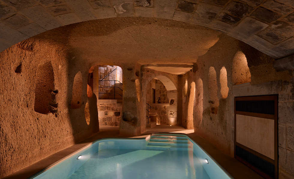 Cappadocia is drenched in hues of brown and beige, and Argos Spa pulls that peaceful palette into its interiors bedecked in linen and wrought iron. Centered on four key pillars—energize, harmonize, cleanse, and indulge—the dramatic cave sanctuary was built on a complex site: Five heritage mansions couldn’t be disturbed; construction required navigating steep slopes; and arches and vaults were carefully added to protect against collapse. In true Cappadocia tradition, Argos Spa embraces native yellow Avanos and gray Kayseri stones, as well as limba wood and Anatolian mosaics, while richly detailed surfaces point to külünk, a centuries-old handcarving technique. “We had the chance to spend a lot of time in the region. Local producers, ceramic artists, stonemasons, and surrounding archaeological sites allowed us to approach the design from a different perspective,” explains Rana Karadoğan Akın, chief design and construction officer at Doğuş Hospitality & Retail. “We wanted to design a project where time stands still and reflects the spirit of ancient times—from the bird sounds heard in the valley every morning and the snow falling in winter to the all-around magic of Cappadocia.”