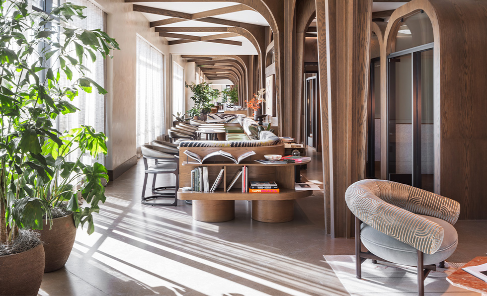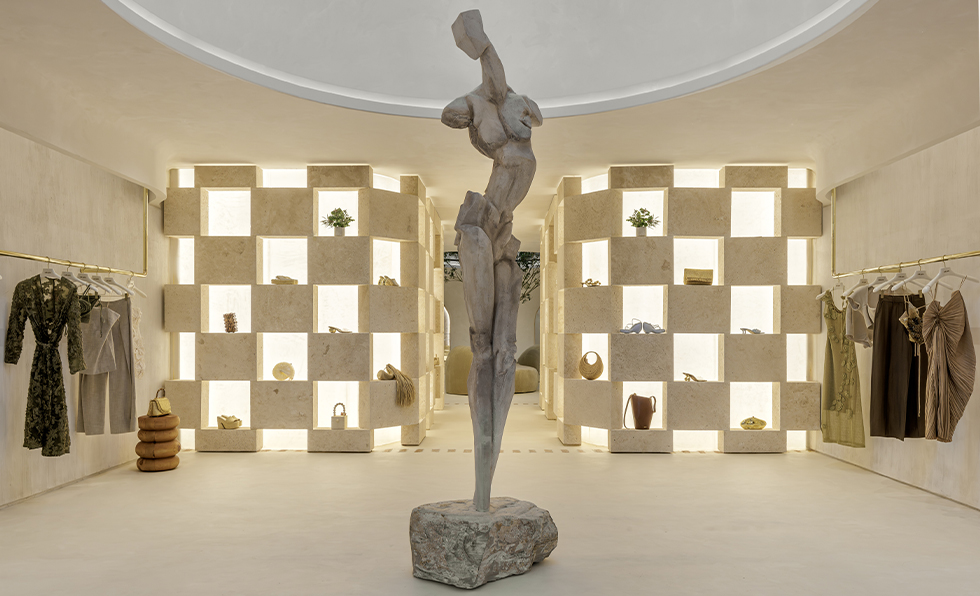 Like the Los Angeles original, Cult Gaia’s flagship store in the Miami Design District is a coveted destination for breezy ready-to-wear women’s apparel, shoes, and accessories. But this time around, the 1,500-square-foot space transcends mere product displays. The A-framed casita-style structure first catches the eye with its façade, clad in a blue-toned Tree of Life mural referencing both 18th-century Indian textiles and the founder’s Persian heritage. It’s just as dreamy inside. A concrete female nude sculpture and a 14-foot-high Banyan tree are planted underneath two domes juxtaposing garments that dangle from unlacquered brass rods and the dressing room area, which is composed of chiseled sandstone blocks calling to mind caves. Visitors can also head to the bespoke sofa or matcha bar. “Miami has become the epitome of experiential architecture and interior design in a place you would least expect to find it: a retail shop,” points out Jess Nahon, co-principal of Sugarhouse. “This project represents a new generation of design, and it has disrupted the typical notions of what shopping should be.”