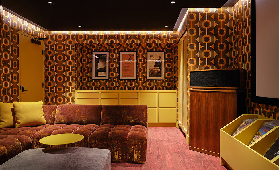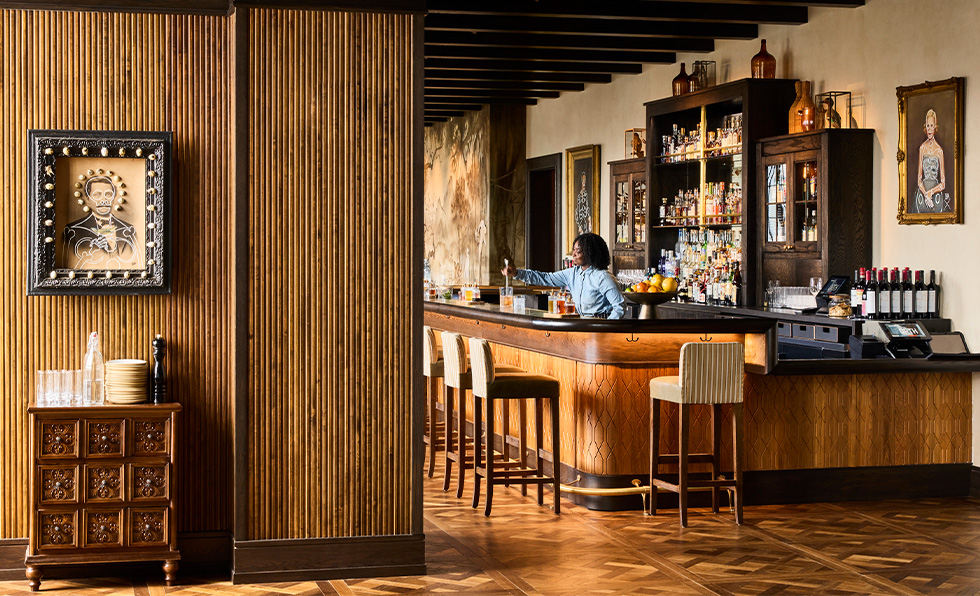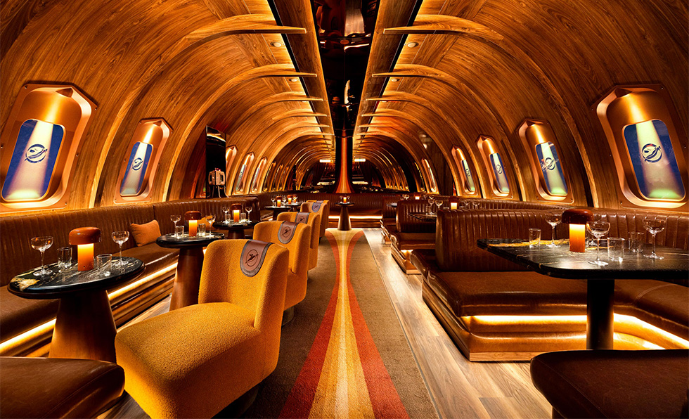 A bespoke stamped boarding pass grants passengers access to their memorable flight on Carry On Airlines, a nostalgic cocktail bar that conjures the golden age of travel. The journey begins on the carpeted jetway leading to a bygone first-class cabin decked out with walnut, brass, and leather. In the cockpit, vintage uniform-donning bartenders concoct drinks behind a curving bar, an LED display of real-time aerial footage in the background. Reclaimed aircraft seating, ever-changing lighting, and touches like a soundtrack of jet engines and in-flight announcements imbue the space with a sense of theater. “Carry On blurs the lines between aviation fantasy and reality,” says PETERMAX founder and creative director Peter Bowden. “It’s where Eero Saarinen’s space-age modernism meets Hugh Hefner’s 1970s glamour—sleek lines, a playful spirit, and an unapologetic embrace of escape. We weren’t designing a bar; we were staging a departure.”