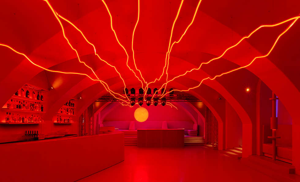 Set in a historic space with existing vaults, Department 57 marries a moody black-clad bar—complete with a hidden ice cave—with media installations found on the dance floor elevated by a glowing orb beside the DJ station and bolt-like light strips streaking across the ceiling. “Even the smallest deviation would completely break the effect, so we provided detailed technical drawings to preserve the exact visual geometry,” says DA Bureau senior architect Kamila Gilmutdinova. Making those curves in real time proved challenging for the firm, “because the flexible light tape couldn’t bend that sharply; it took a lot of prototyping to get it right,” she adds.