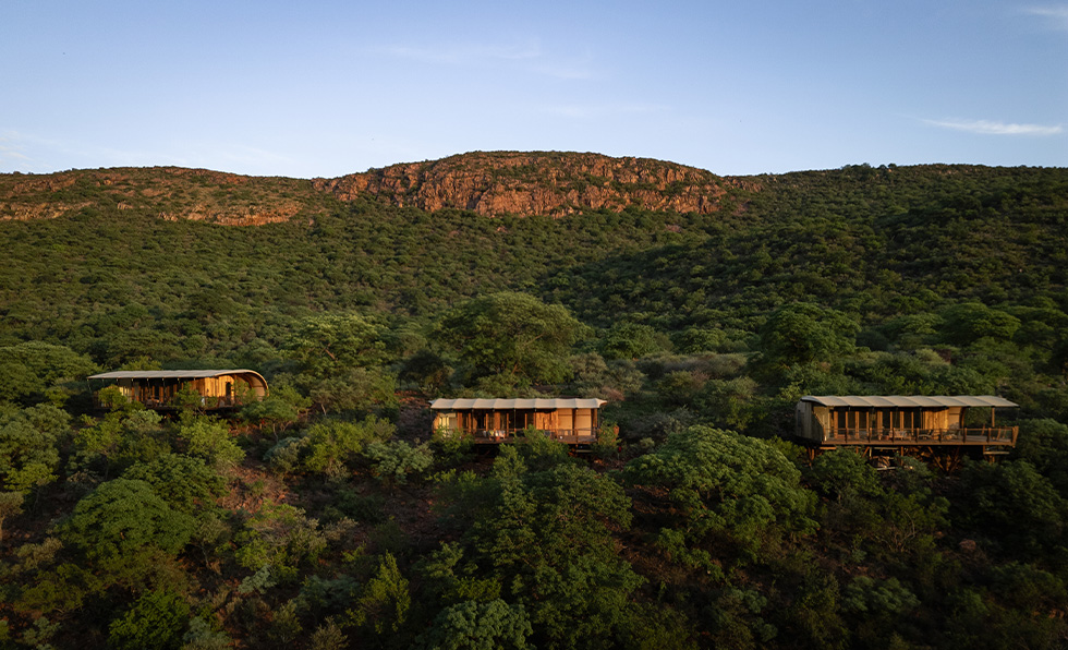 Few & Far Luvhondo was born from two equally important ideas: “minimizing the environmental impact of our design and creating a space that offers a deeply restorative, meditative experience,” says Willeen Bosch, associate interior architect at Ohkre Collective. “Our goal emerged clearly: to design a lodge that feels rooted in the land, not imposed upon it.” Solfari, the solar-powered aerial cable car that takes after the nests spun by weaver birds, revisits the traditional safari concept and encapsulates the property’s eco-conscious mission. Additionally, local artisans were called upon to make furniture, art, and textiles. Architectural elements from the six tented cliffside suites mirror the organic forms of the native shepherd, sycamore fig, and baobab trees, amplifying natural ventilation and cooling that reduces energy consumption. Hues of deep blue and clay speak to the sky and red soil of the Soutpansberg Mountains, while “textures are drawn from local geology,” adds Bosch. “Every decision was made to strengthen the connection between guest and environment. We emphasized local craftsmanship and sustainably sourced materials not only to reduce our footprint, but also to tell a story of place, culture, and regeneration.”