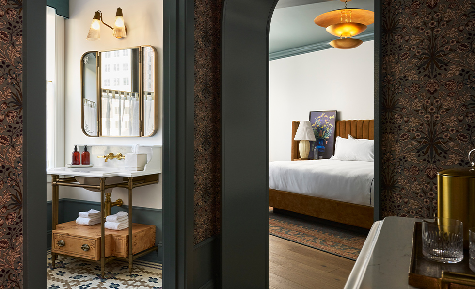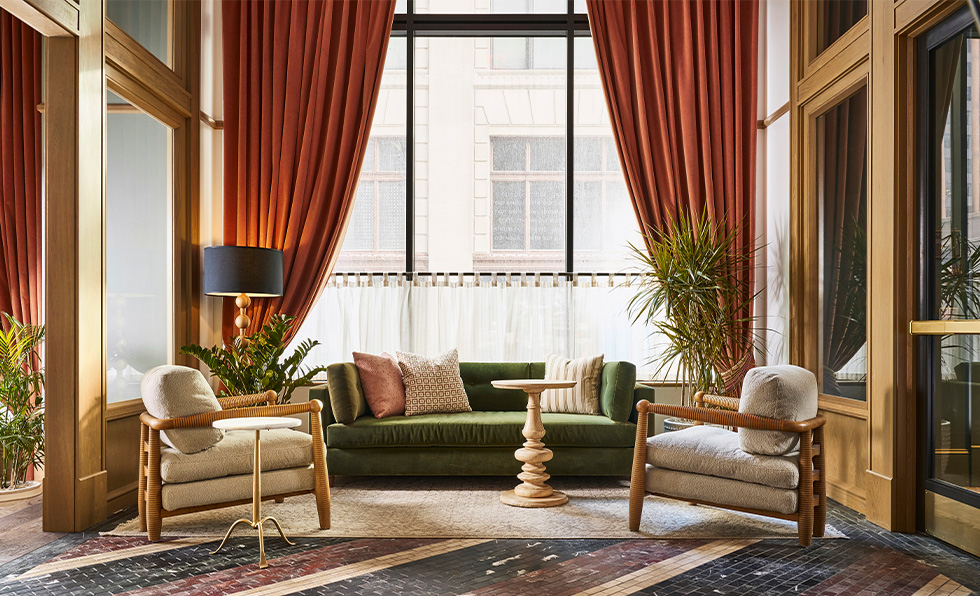 Downtown Cleveland received a burst of fresh energy when a 103-year-old Neoclassical structure was converted into the Fidelity Hotel. On the ground floor, one-time retail bays with large storefront windows were turned into a series of distinct spaces that organically flow into one another. Off the art-filled foyer is the lobby, where the reception desk is animated by two works from local multimedia artist Lauren Pearce. It spills into the Club Room, the all-day restaurant, bar, and lounge awash in coral hues and anchored by a banquette framed by arched interior windows. Here, a salon wall showcasing more than 35 pieces of ephemera—from pennants to matchbooks and news clippings—introduces diners to Cleveland’s fascinating history. In the intimate Snug Room, the ceiling is covered in a mural depicting verdant foliage, while the handpainted scene on display in the private dining room reinterprets the Cleveland skyline. “Given the handsome lines of the building and its tucked-away location off a bustling main thoroughfare, there was a longing to both allude to the grandeur of its architectural magnificence while layering in contemporary touchpoints and gestures,” says Daniel Pierce, cofounder and design principal at Curioso. It’s reverential while also forward-leaning.”