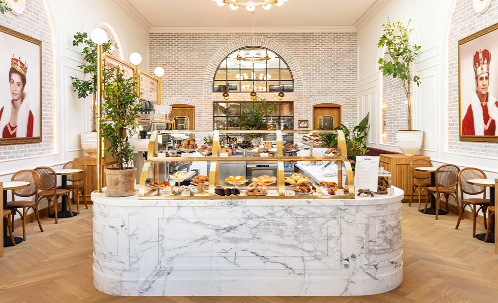 Through an expansive glass window, patrons at George’s Donuts & Merriment peer into the open kitchen, where the day-into-night café’s signature treat is filled, fried, and glazed before their eyes. This culinary performance unfurls in a revamped 1930s Art Deco building in San Francisco’s West Portal neighborhood that is informed by grand European patisseries. Crowned with a skylight, it mingles a 30-foot-high ceiling with white marble countertops, bistro tables ringed in gold, and two oversized portraits, the subjects clad in full-blown regalia that imbues George’s with a hint of the majestic. “It’s like stepping into the heart of a jelly donut: rich, vibrant, and wildly unexpected,” says Jacob Cross, managing director of ROY Hospitality. “It’s the kind of surprise that makes you smile, a wink tucked into the space.”