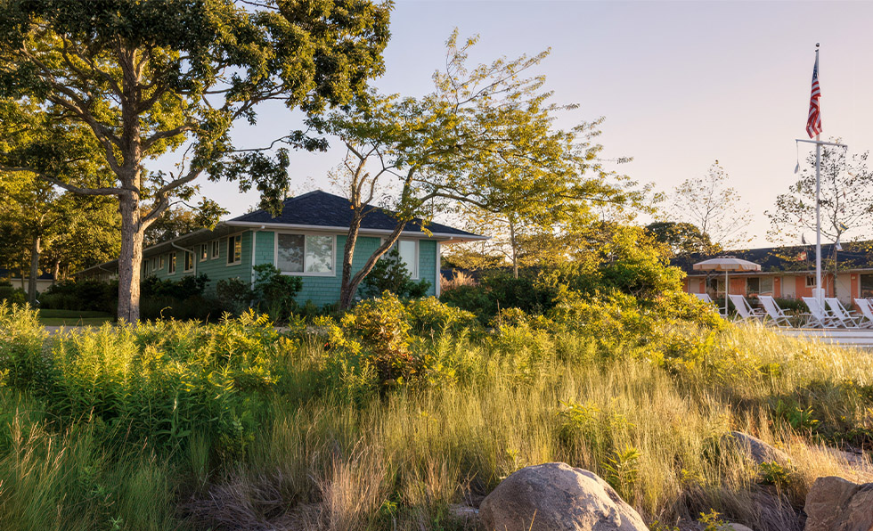 Home to an 18-acre protected salt marsh, a 15-acre underwater oyster farm, and 1,400 feet of beachfront, the refreshed landscape design of the Silver Sands Motel & Beach Bungalows emphasizes a strong connection to nature. Indeed, mature trees were retained, native flora replaced turf, and beach grass now anchors the dunes. The renewed biodiversity has also encouraged the return of nesting ospreys and other shore birds. A standout feature is the “deep bed of native perennials planted directly into sand that provides paths through the breezy grasses and areas to sit among the flowers, birds, and pollinators,” says Melissa Reavis, partner at Hollander Design Landscape Architects. “It’s an invitation to engage with nature.”