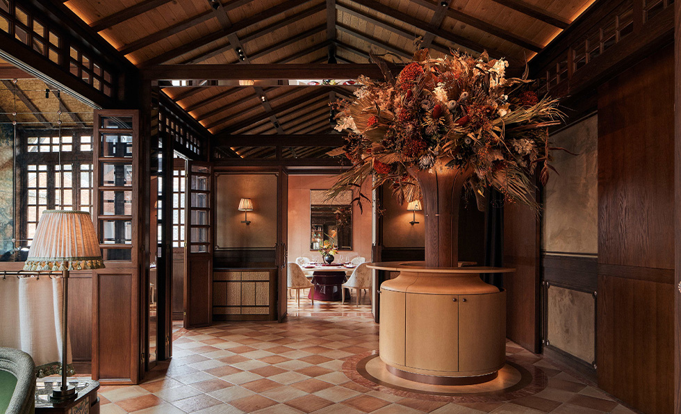 Ortensia’s flair for fusing heritage elements with modern ones is found throughout the well-preserved Shikumen structure in Shanghai’s Zhangyuan community. Consider the Chinese lacquer and hand-chiseled wood millwork converging with the ombré velvet wall panels and custom light fixtures warmed with gradient-dyed textiles. Rustic floor tiles laid out in a checkerboard pattern juxtapose French panels reimagined through floral metalwork, while pitched ceilings in the private dining room balance a contemporary finish with original beams. The restaurant’s namesake flower is also a recurring motif, framing the courtyard entry and inspiring a bronze-etched mirror. “Every space is a story, and a good narrative needs strong foundations,” says Chris Shao, founder of his eponymous studio. “The chance to dig deeper into the history, customs, and design traditions of China, Japan, and France was a highlight for me. This melting pot of cuisines and cultures is what makes Ortensia’s design impactful.”