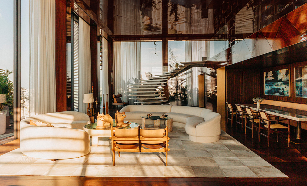 Sitting atop the Jean Nouvel-designed Mata Atlântica Tower at the 181-room Rosewood São Paulo, the three-story, four-bedroom penthouse suite comprises more than 12,000 square feet of space distinguished by a floating white concrete staircase that pays homage to Brazilian architect and designer Oscar Niemeyer. “It took some thoughtful engineering to balance its sculptural feel with real structural integrity,” says Edouard Grosmangin, regional vice president , Mexico and South America, at Rosewood Hotels & Resorts. More nods to Brazil are found throughout, including local wood and stone, custom joinery, and artwork from Tarsila do Amaral and Jean-Baptiste Debret. The suite is anchored by more than 250 native plants and trees. “The rooftop garden was designed as a natural extension of the Mata Atlântica Tower’s biophilic concept. More than just a landscape element, it creates a private, immersive connection to nature,” says Grosmangin. “The suite balances scale with intimacy, inviting you to slow down, take in the views, and experience São Paulo from above.”