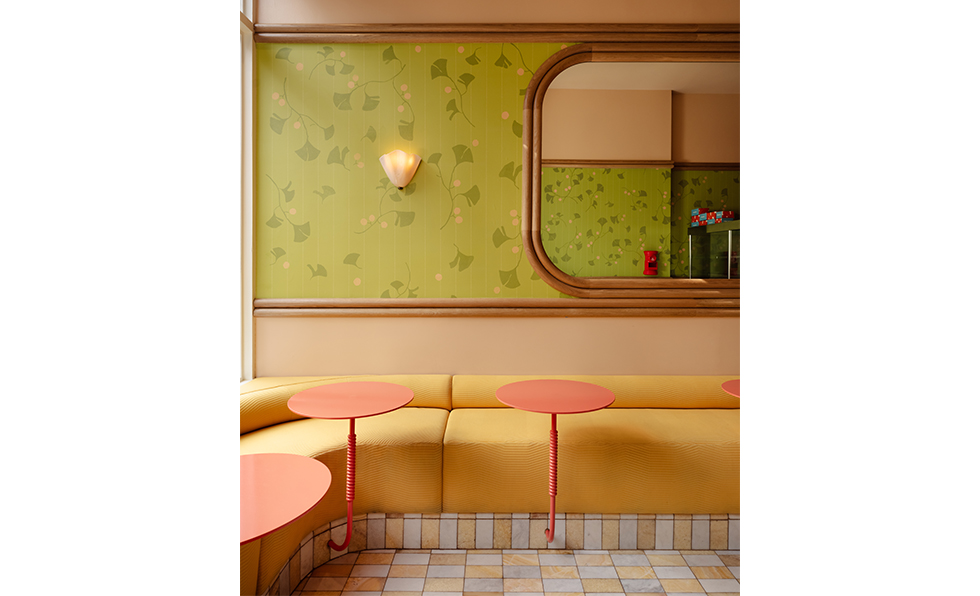 Before tackling the design of Postcard Bakery, the team at Sarah Carpenter & Studio was given a Spotify playlist curated by Postcard co-owner Lisa Limb. The designers listened to the mix repeatedly for inspiration. Vintage Japanese postcards and artwork from the 1920s Taisho era were also starting points, propelling the designers to pair butter yellow quilted banquettes with golden tiles and peach walls. A lime green wallcovering developed with LMNOP, the agency behind Postcard’s visual identity, is framed in custom oak millwork, its botanical pattern recalling the oeuvre of 20th-century artist and illustrator Yumeji Takehisa. Its mellowness contrasts with the arched service area draped in vermillion red. “Inspired by the idea of time travel, we wanted to teleport guests into a vibrant and sweet escape from the bustle of New York,” says firm founder Sarah Carpenter.