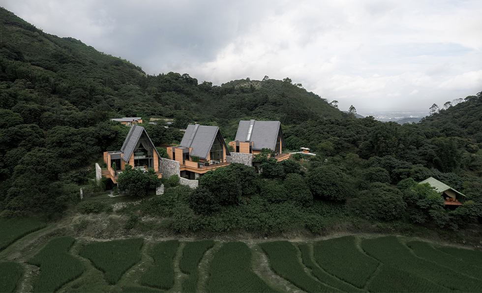 At the base of Yao Mountain in a 400-year-old Hakka village in Guangzhou’s Conghua district, Ji Yun Yao Resort blends into the sweeping, verdant landscape. The 22 guestrooms, scattered among steeped and sloped structures alike, drip in earthy hues, their windows framing idyllic views that change with the seasons. An interplay of light and shadow awaits in the reception area, welcoming visitors with a fireplace, greenery, and candlelight. Throughout the day, those guests gather in the indoor-outdoor restaurant, with its floor-to-ceiling windows and firepit, or dip into the stone pool that seemingly emerges from the mountains. In tribute to Hakka values, traditional rammed earth materials were chosen for the complex of buildings, but their silhouettes are decidedly contemporary. “The team wanted to create an ideal place of nature,” says Uno Chan, founder of TOMO Design, “where modern urbanites can live in peace and contentment.”