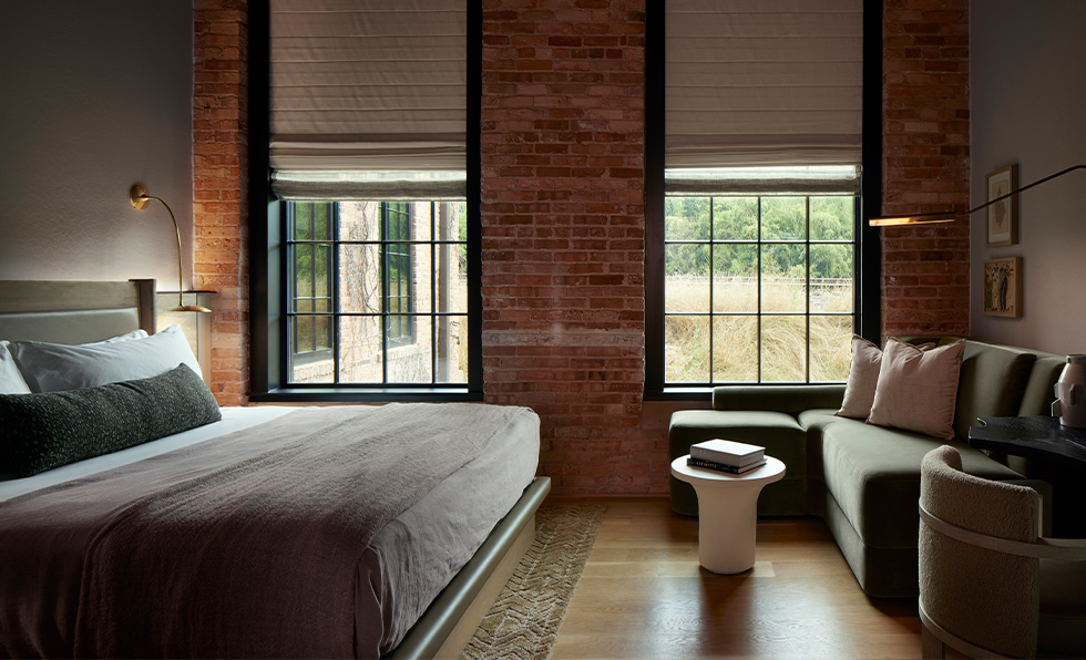 These include shou sugi ban walls, fluted oak vanities, and bespoke creamy denim drapery. Like the exposed brick and oversized wood beams salvaged from factory days, the stone—handlaid marble in the lobby, natural travertine in the guestrooms, and Michelangelo and Tortuga quartzites in Osteria Olio restaurant—feels as if it’s always been part of the property. “From the beginning, it was important that this not only be a beautiful destination for visitors,” adds Whitley. “It’s more than just a hotel—it’s a thoughtful restoration and a new community anchor, grounded in place, memory, and possibility.”