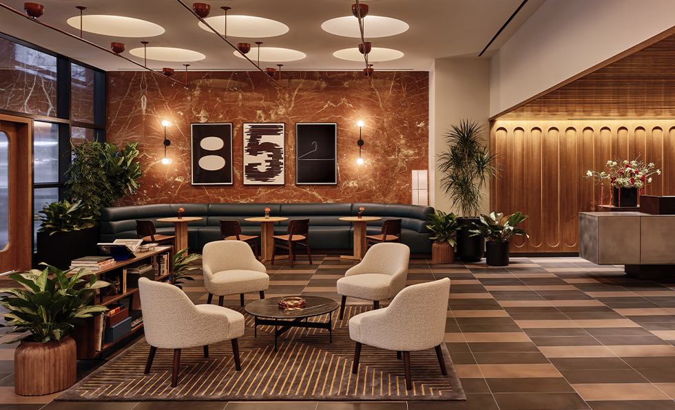 A swank but inviting private club air permeates the vintage art-adorned public areas at Romer Hell’s Kitchen. Guests organically weave their way through a sequence of vignettes, including the reception desk fashioned out of brushed aluminum and walnut burl wood backdropped by sleek, pill-shaped panels. A custom banquette grounds the living room, and the Hell’s Kitchen Neighborhood café stars a mosaic tile floor pattern that calls to mind the building’s 1960s-era roots. There’s also the Corner Store, a showcase of locally made goods, and the Study, a cozy hangout warmed by an amber glass fireplace. “The orange marble walls in the lobby are from the original interior by Morris Lapidus. We wanted to celebrate them, so we crafted the finish palette around them,” says Goodrich creative director Rosie Rainbow. A trifecta of cantilevered chandeliers also make an impression on the entrance area’s raised ceiling, as do the bespoke linear uplights “that illuminate the insides of a series of arched domes,” says Hines Fischer, the studio’s lead product designer. “The integration of lighting and architecture creates a dramatic transformation of the space.”