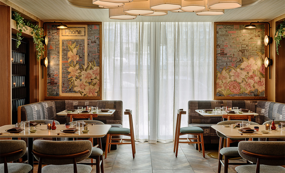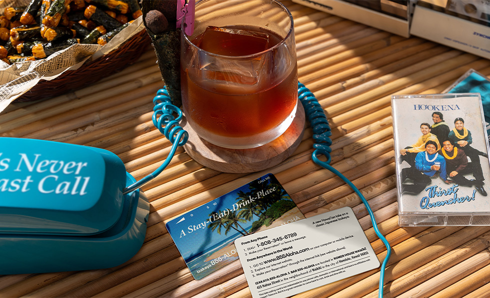 Delicate pink and white blooms flourish against a background of royal blue on the sides of defunct, yet still rampant, Hawaiian Telcom payphone booths. Stickers promoting 1-855-ALOHA-00—once used to reach an operator—prompted the name of the izakaya at Romer House Waikiki. Local illustrator Solario recreated retro phone book ads, while large-scale photographs that are an ode to the coin-operated payphone come courtesy of Joe Rovegno. The visual identity follows suit. “We were inspired by the graphic impact and nostalgia of some of Hawaii’s disappearing iconic phone booths. The restaurant branding became an opportunity to preserve their stories and imagery,” says Callie Peck, creative director of the Studio at Highgate. The menu’s layout and topography nod to the 1987 Oahu Yellow Pages, checks are accompanied by chocolate quarters, and staff wear embroidered “Call Me” chef coats and server shirts that match the cocktail napkins emblazoned with the same directive. “Our goal was to capture the electric energy and analog connections of a time when payphones, calling cards, and the Yellow Pages were central to daily life,” adds Peck, “a moment that’s been lost to, but often craved by, the smartphone generation.”