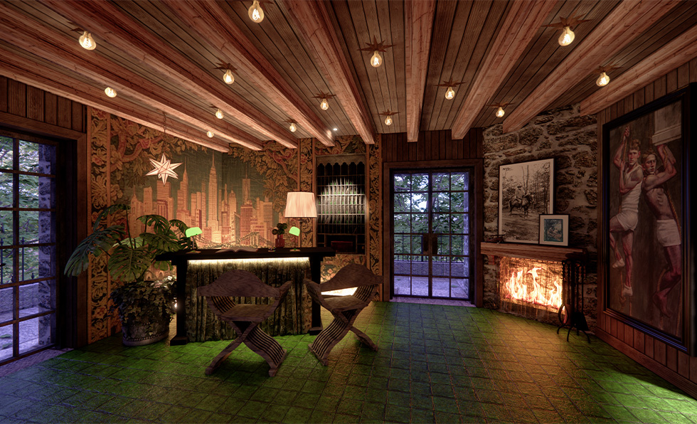 The long-abandoned, recently purchased castle of outdoorsman David T. Abercrombie, cofounder of famed retailer Abercrombie & Fitch, stirred Harrisburg University of Science and Technology student Sheng Wei Yang to imagine the Hudson Frontier in Ossining, New York as a discreet, scenic travel oasis. For the property, Yang conceived of a mix of castle suites and surrounding cabins, as well as a bar tucked into the building’s tower, alfresco dining underneath a canopy of trees, and a pool that blends in with the terrain. A reverence for nature is also central to the design, encapsulated in materials like locally sourced stone, reclaimed wood, weathered metal, and well-worn leather. “This project was born from a longing for a more romantic era—a time when artists, adventurers, and dreamers escaped the city to build poetic lives along the Hudson River,” explains Yang. “I envisioned the Hudson Frontier not merely as a destination, but as a living story—a soulful retreat where time lingers in the stone and nature gently reawakens our sense of wonder.”