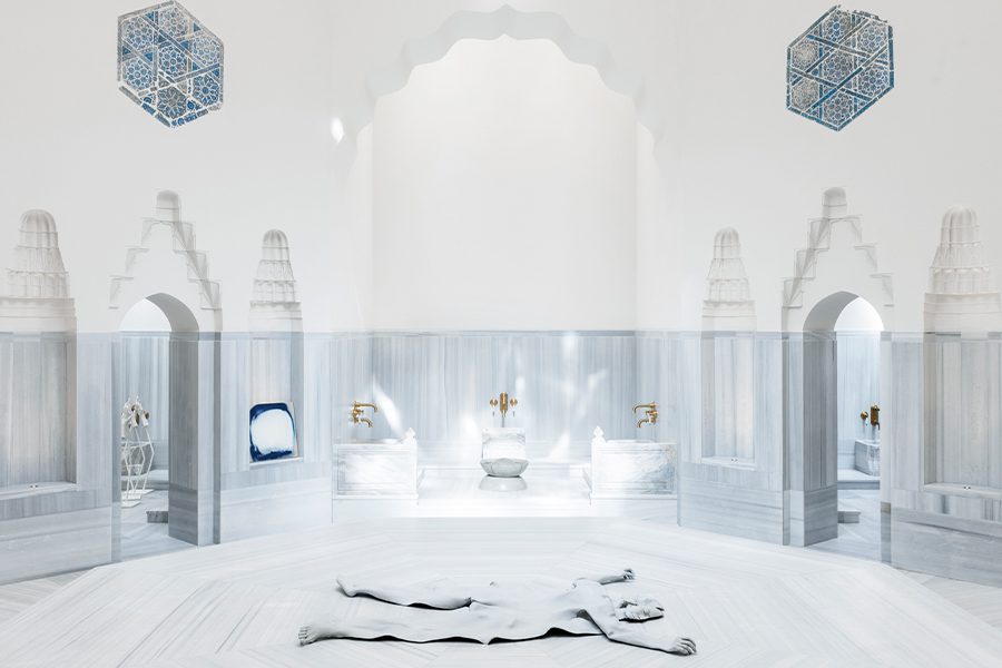Atelier Brückner of Stuggart, Germany, an architectural firm specializing in exhibition design, worked to preserve the hammam’s lost tiles, which were an important part of the site’s history and were the basis for the museum, where tile displays run along a narrow strip of the building and extend into an outdoor courtyard. “The whole experience is a valuable cultural offering,” says senior designer Emma Kilday. “You can have your spa day and then learn more about the history of this unique experience and setting.”