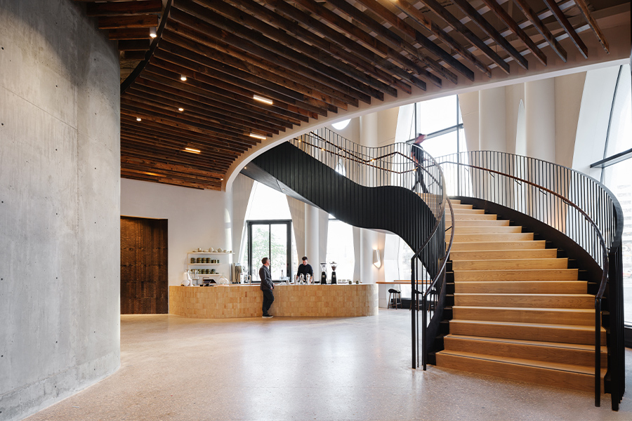 From Little Owl coffee bar, a sculptural grand staircase ascends to the second floor meeting spaces