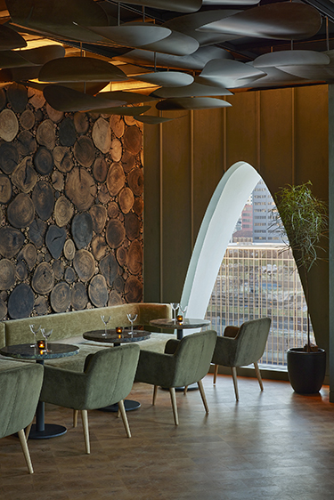 Wildman Chalmers was challenged with crafting interiors that matched the pristine building but were also warm and welcoming to guests. While the outside was informed by the forms of the trees, “we wanted the inside to reflect the sensory experience of nature,” says principal and design director Heather Wildman. The journey begins on the first floor, home to Pasque restaurant and Little Owl coffee bar, and extends to the second-floor meeting space up through the 265 guestrooms to the 13th-floor rooftop.