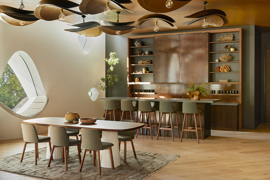 Pops of nature-inspired hues, including mossy green and copper, appear in the Commons lounge on the second floor