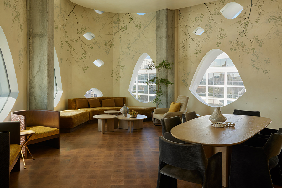 The tree metaphor carries into the guestrooms, with dark corridors (symbolizing the trunk of the tree) that transition to light and bright rooms, which are framed by the scalloped windows. “Your eye is drawn to these great views and shapes,” she says. Guestroom carpets, made from compostable recycled material, also nod to the forest floor, while artwork includes pressed flowers in glass frames that create shadows from the windows.