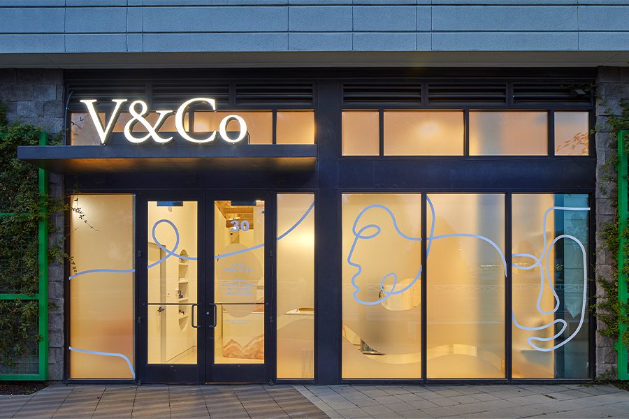 Frosted glass and artful details adorn the exterior of V & Co., a medical spa in San Jose, California