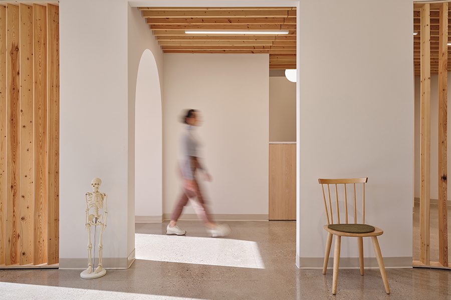 Custom millwork and a 115-foot-long bench line the perimeter, while slatted, locally sourced timber spans the clinic’s pitched ceilings to accentuate the neutral color story and abundant daylighting. “We wanted the space to be void of any visual clutter and to enable a sense of ease and mindfulness,” says architect Jaliya Fonseka. “By designing compassionately with natural light, warm, tactile materials, and intuitive circulation, the space not only meets practical needs but also encourages calm in the body and mind.”