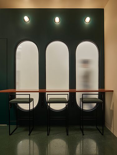 An evergreen-hued wall at V & Co. is punctuated with fluted glass windows