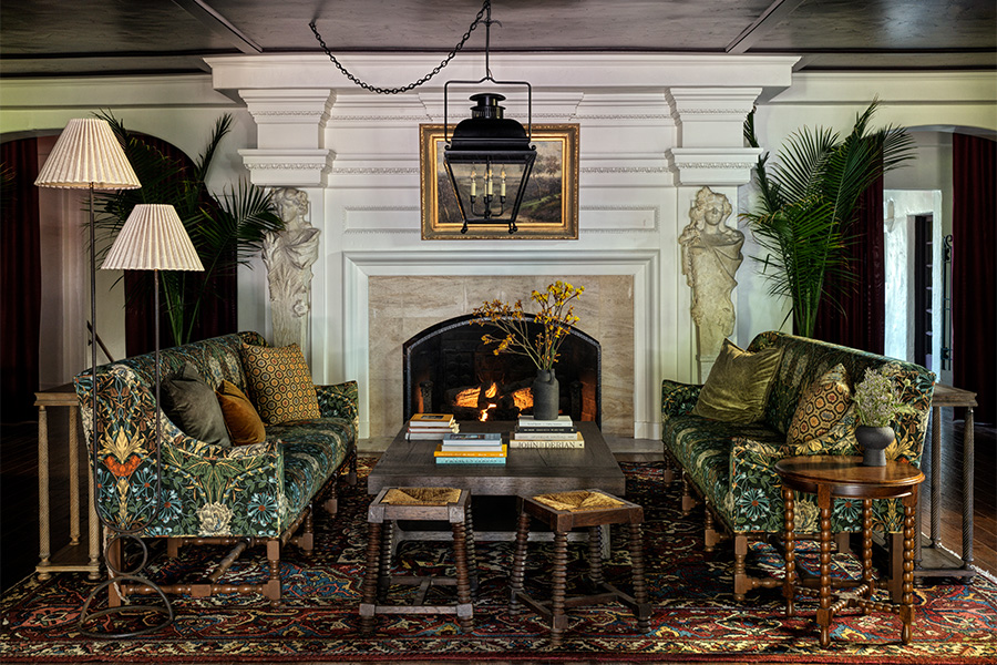 Recently reimagined by Post Company, the lobby at La Playa Hotel in Carmel-by-the-Sea, California is centered around a fireplace