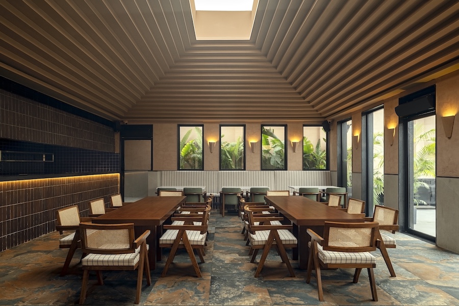 In Noida, Studio Dashline crafts a layered dining destination with angular forms and an earthy palette