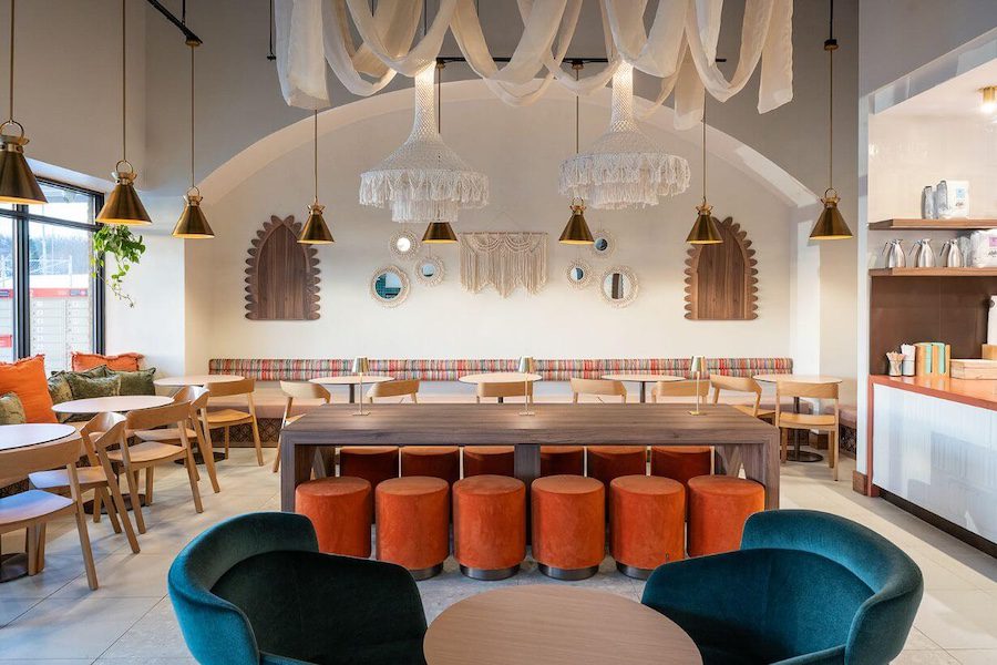 A rich material palette shapes the café, market, and butcher shop into a dynamic experience