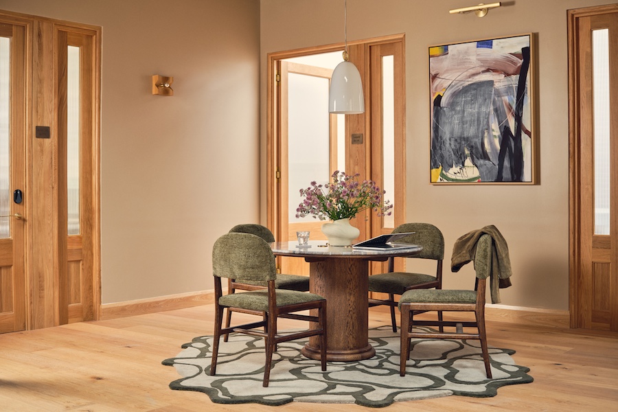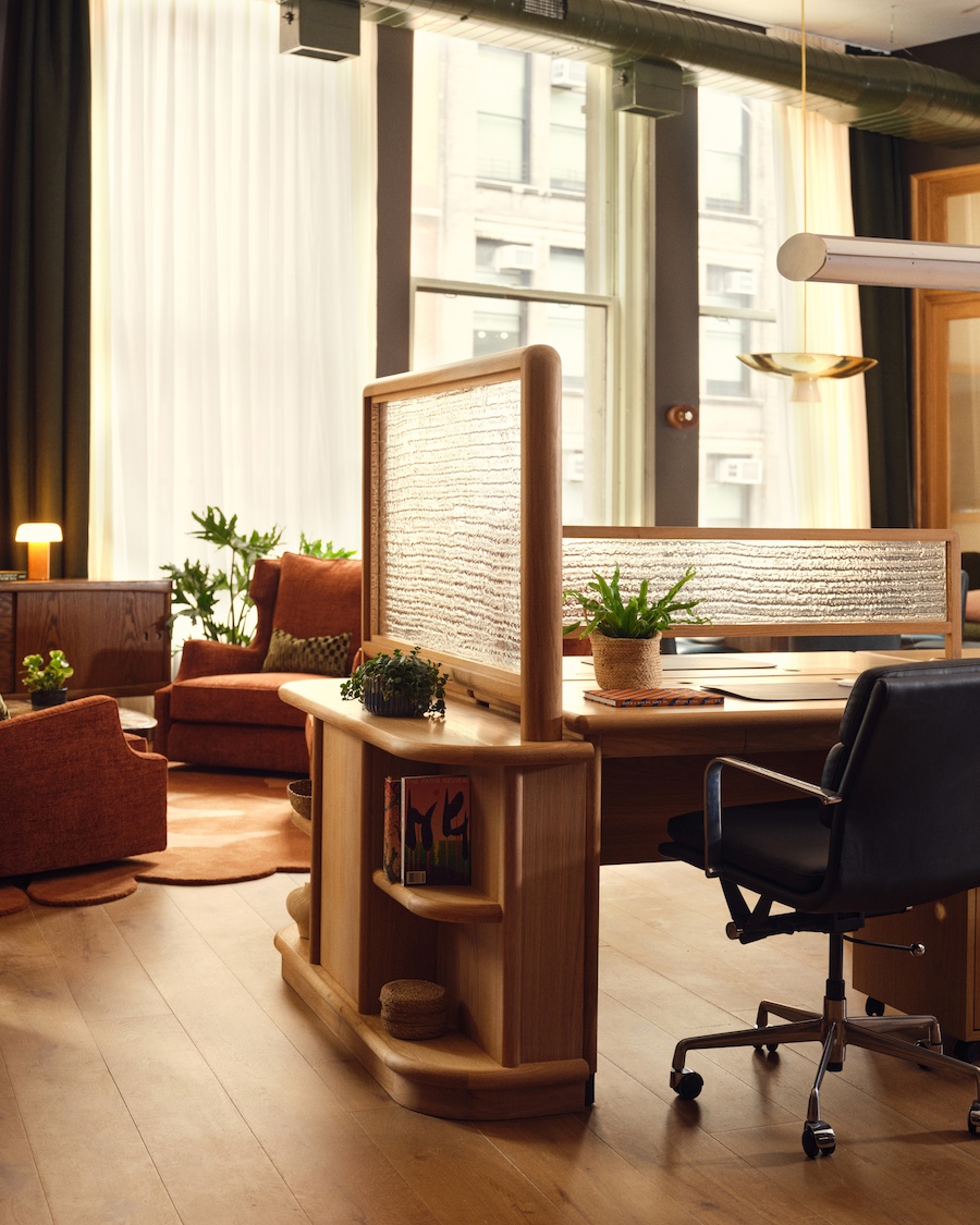 A moody, tactile palette featuring natural materials and layered lighting is paired with solid oak desks, recycled crystal dividers, and a curated mix of soft textures.