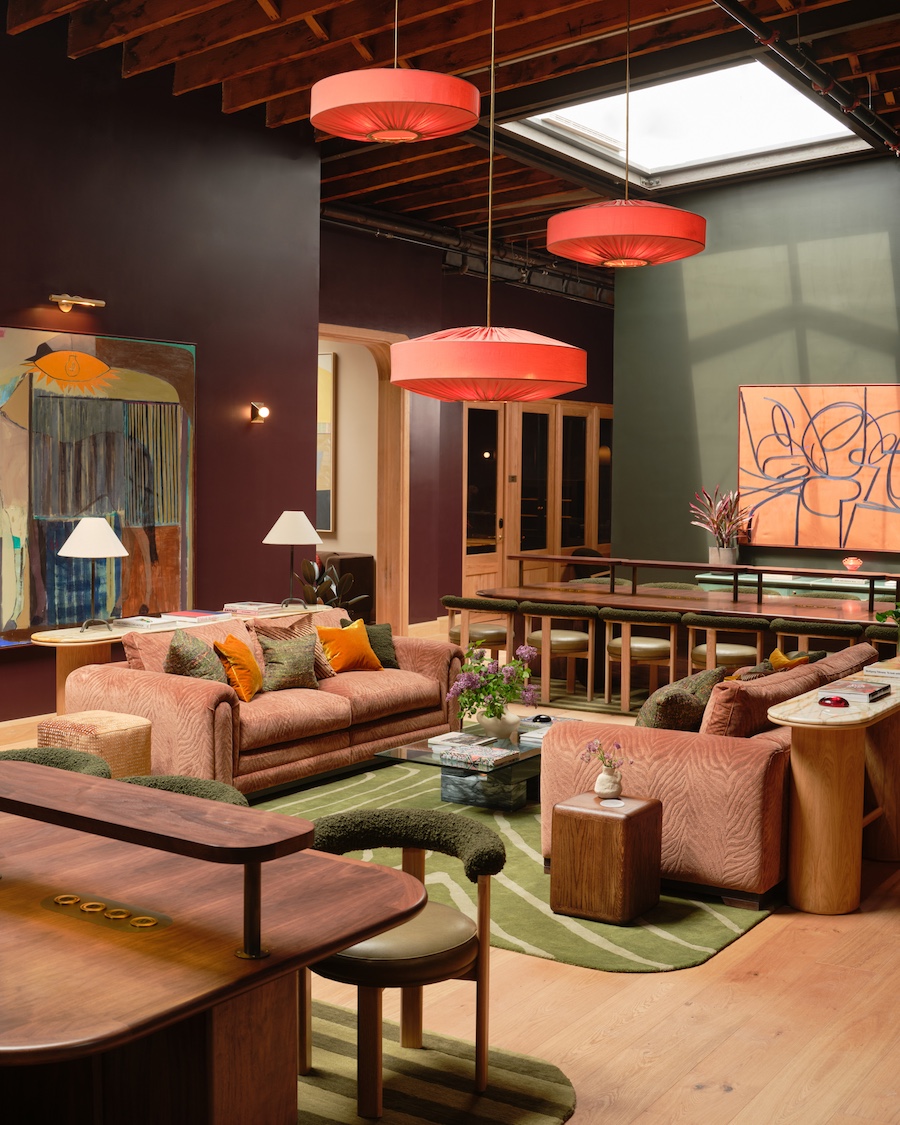 Designed in-house by The Malin’s team, the workspace honors the building’s industrial character, which is defined by soaring ceilings, exposed steel columns, and timber trusses.